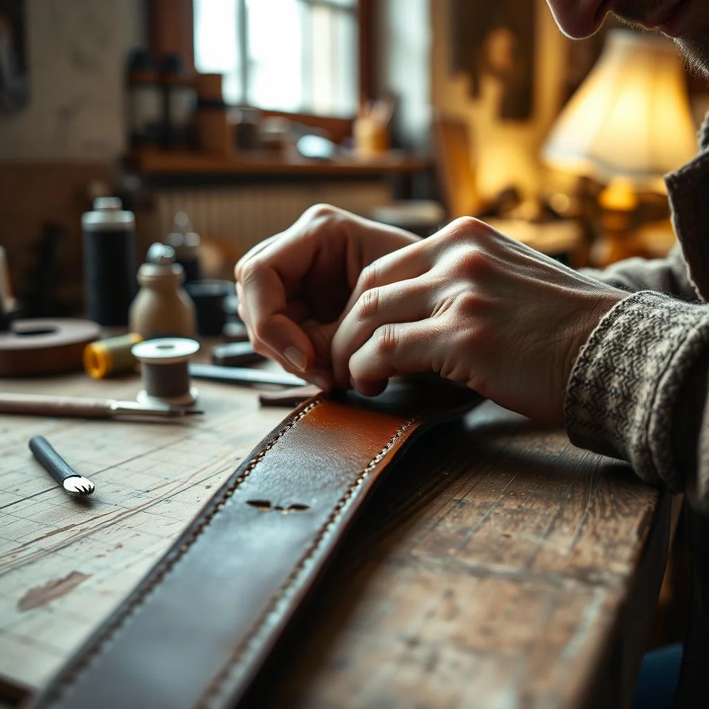 Close-up of skilled hands stitching leather in a workshop, tools scattered on a worn wooden workbench, spools of thread, cutting mat, warm workshop lamp light, artisan craftsman photography